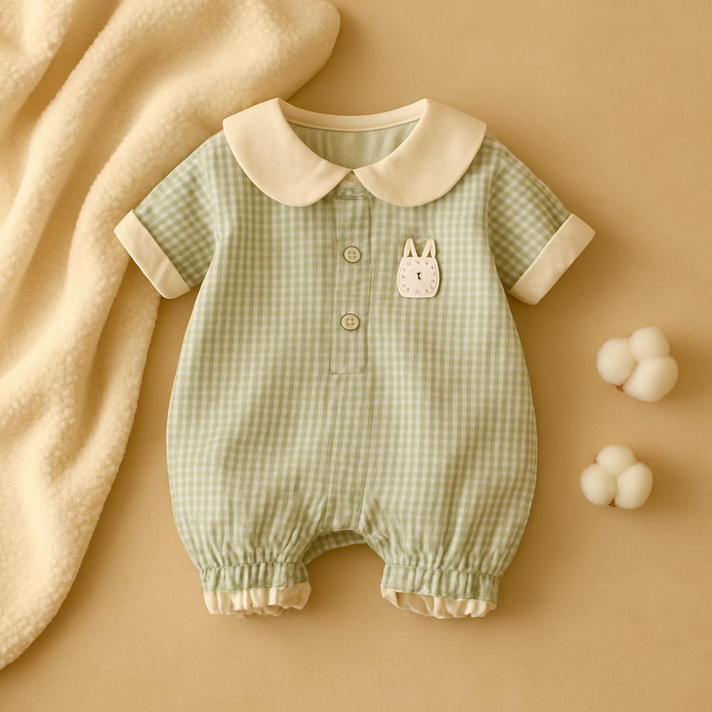 Checkered Short Sleeve Baby Romper with Peter Pan Collar – Soft & Breathable Playsuit