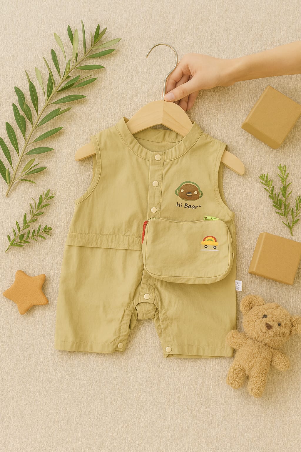 Hi Bear Sleeveless Baby Romper with Pouch – 100% Cotton