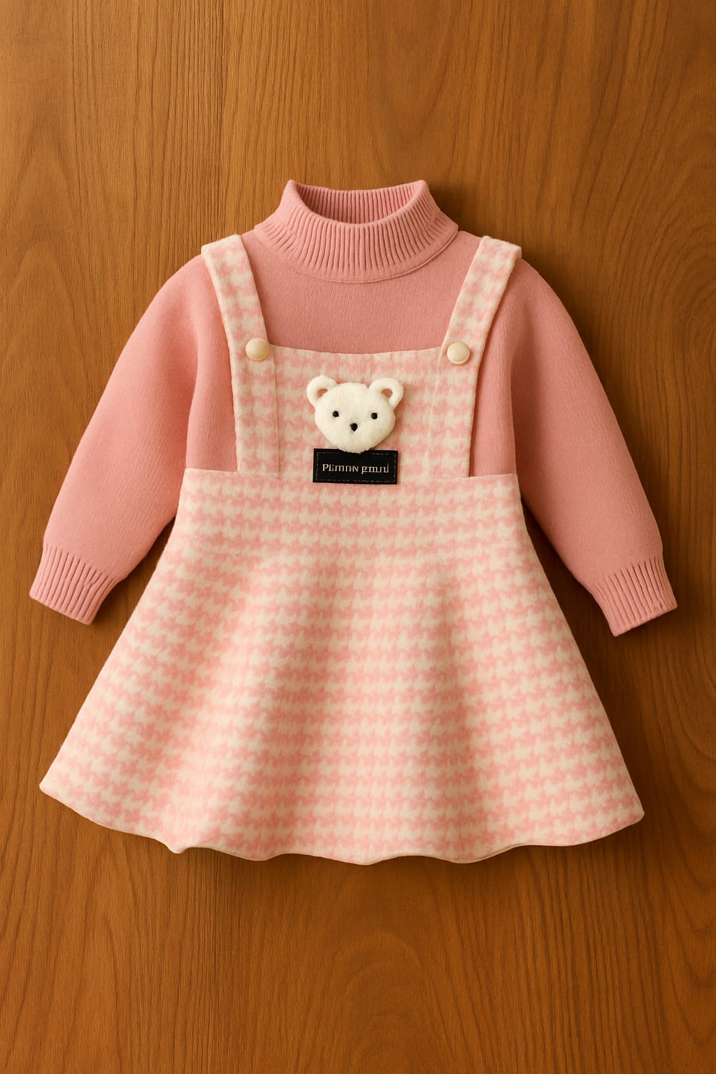 This pink knitted one-piece dress with teddy bear applique is a charming winter essential for...