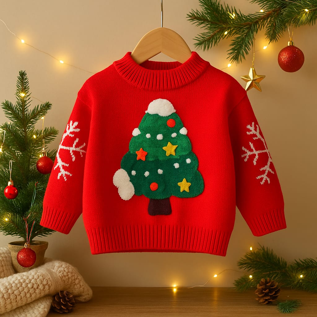 Red Christmas Sweater with Christmas Tree Applique & Snowflake Sleeves