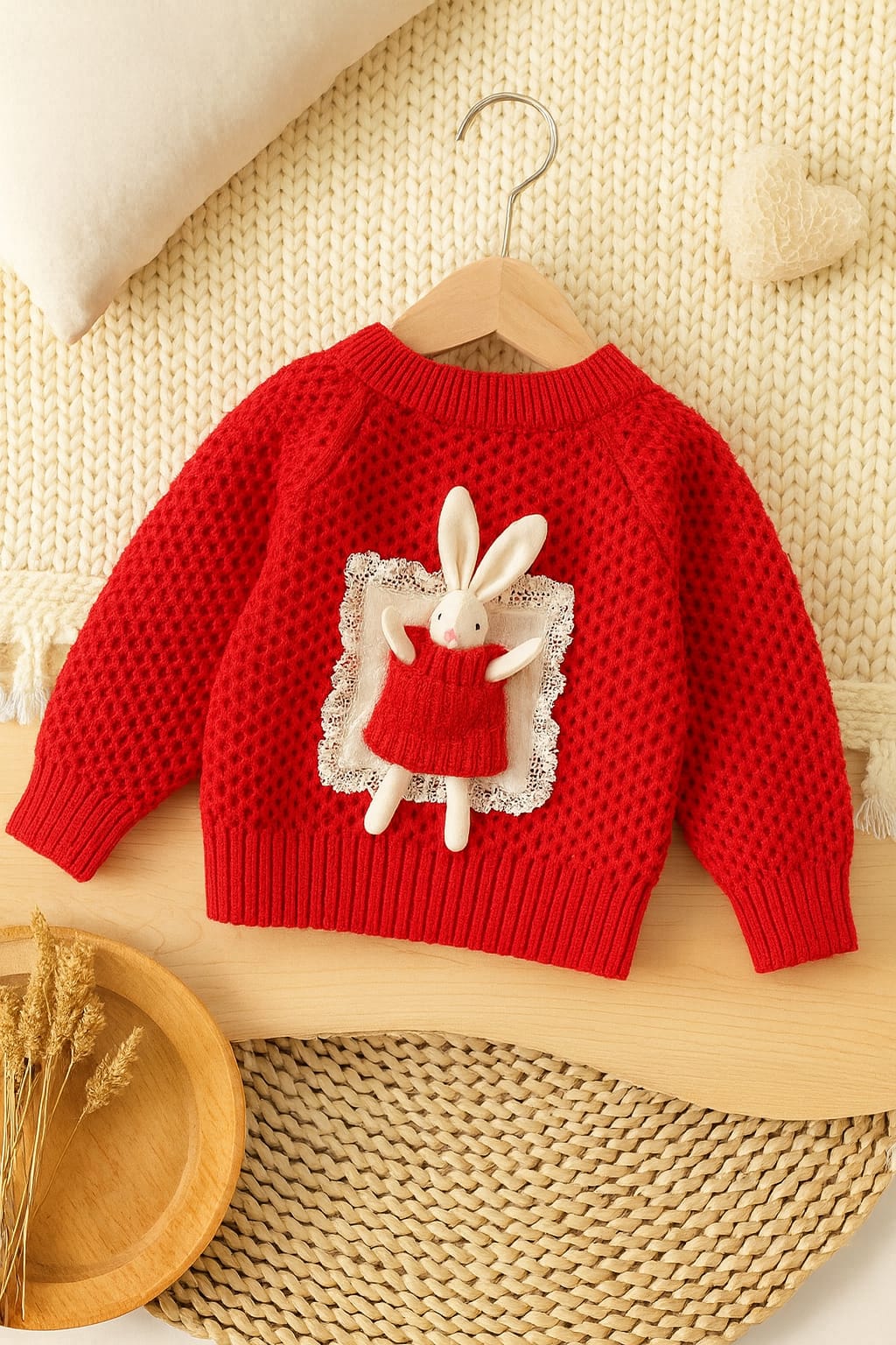 Red Knitted Sweater with 3D Bunny Applique & Lace Detailing