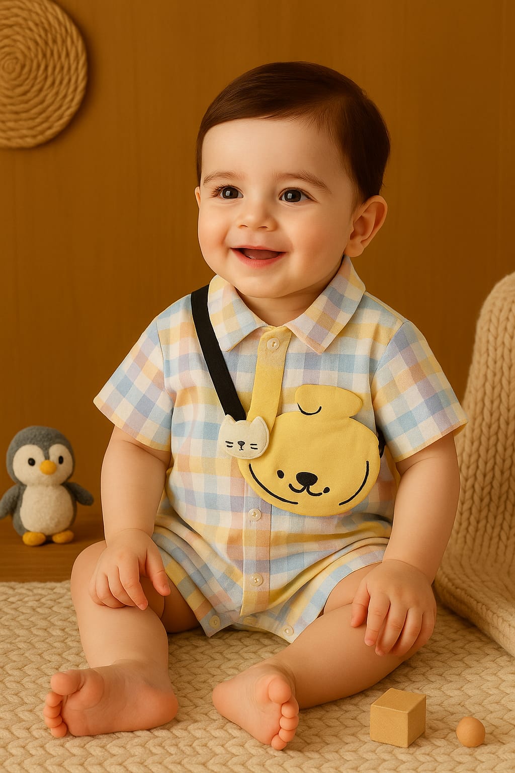 Add charm to your little one’s wardrobe with this baby checkered romper featuring a classic shirt collar and detachable bear pouch. Designed with vibrant pastel checks, this short-sleeve romper is both stylish and comfortable. The snap-button closure makes dressing and diaper changes quick and easy, while the breathable cotton fabric keeps your baby cozy all day long.