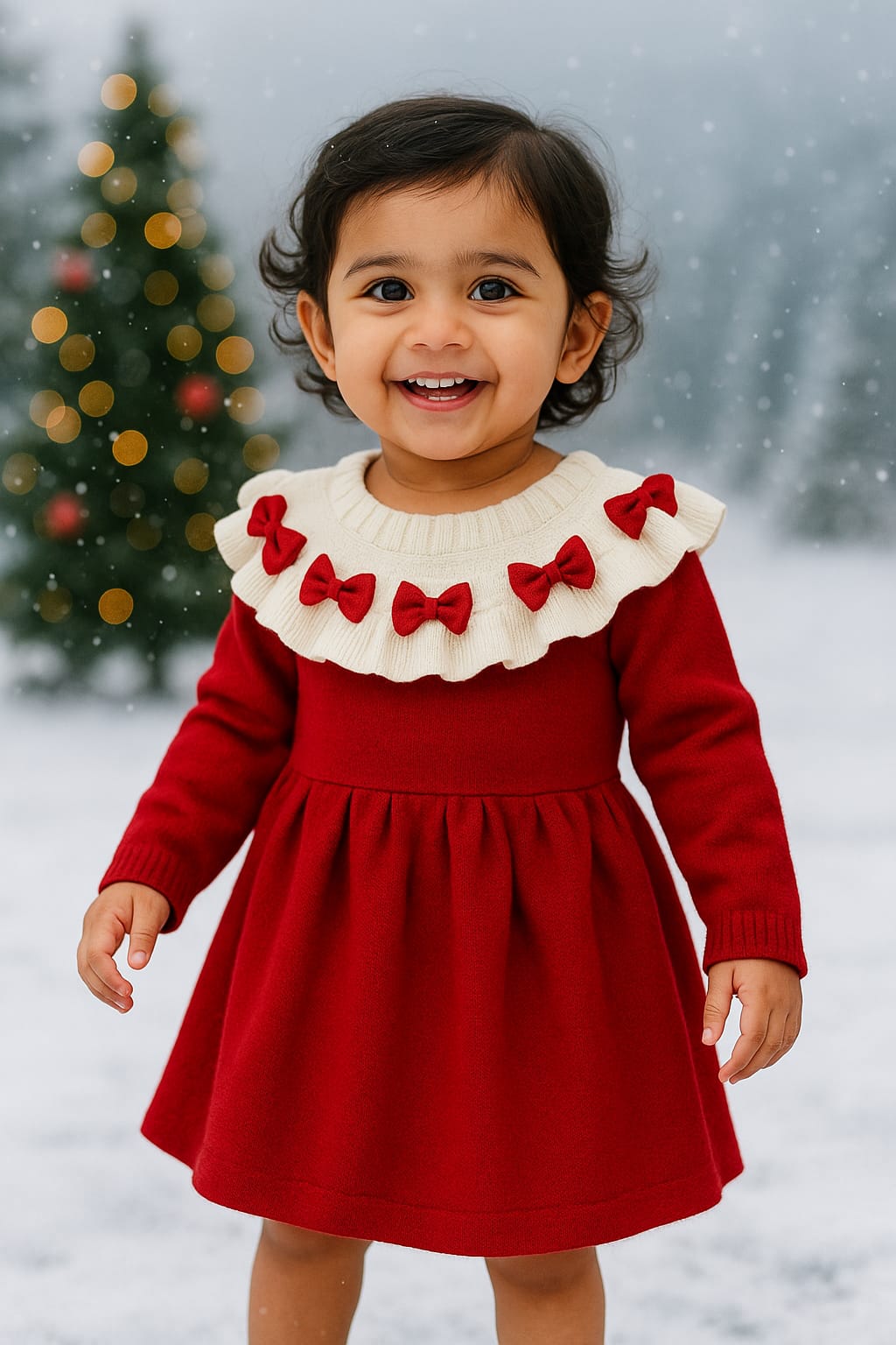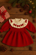 The frilled cream collar adorned with cute red bows adds a charming touch, making it an ideal outfit for Christmas parties, photoshoots, or cozy winter outings. The breathable and comfortable fabric ensures your little one feels as great as they look.