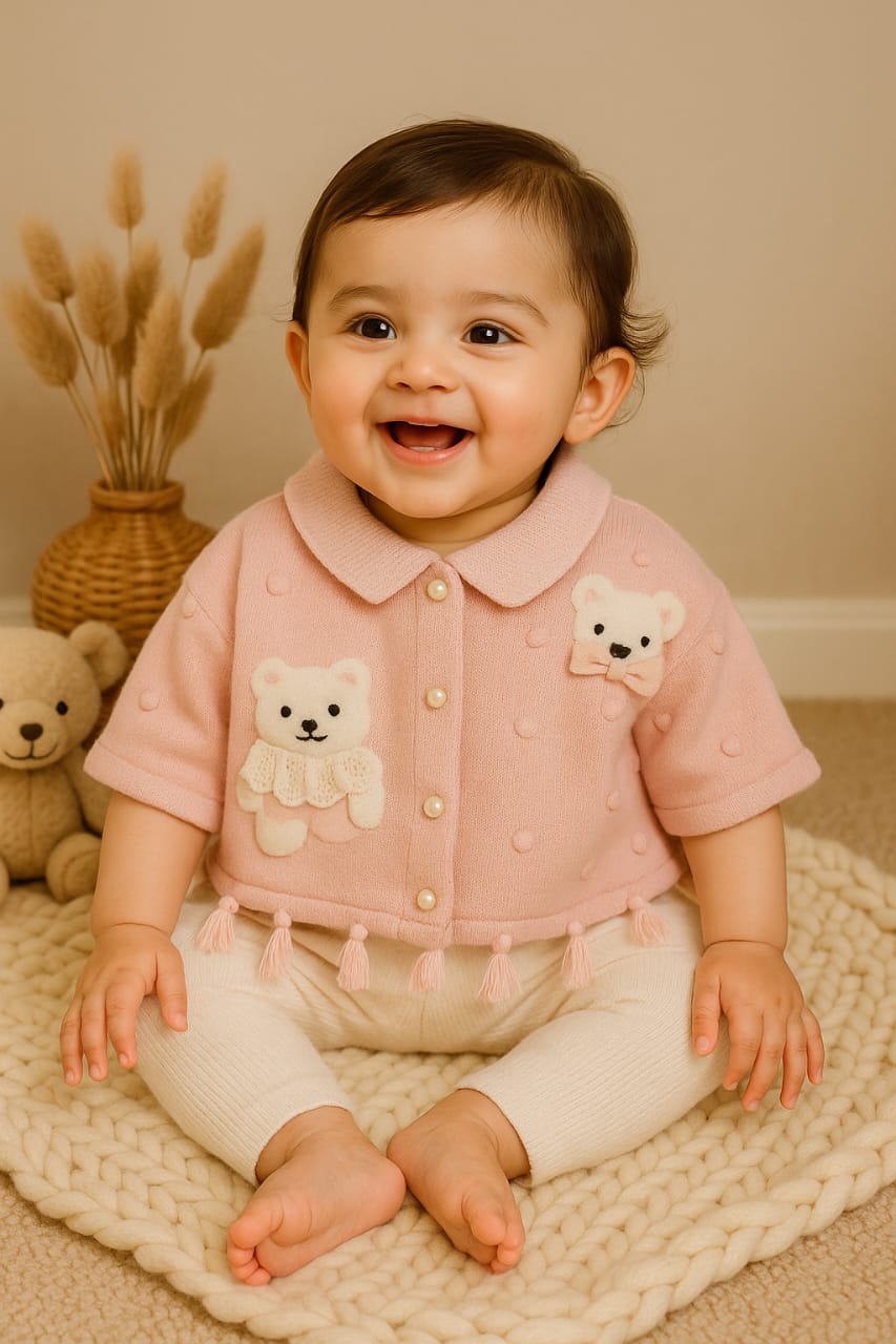 Baby Girl Pink Cardigan with Teddy Bear Appliqué and Tassel Hem