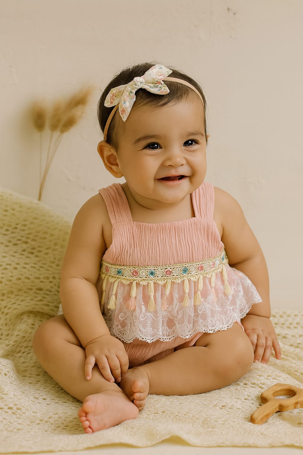 Dress your little one in this adorable pink romper crafted with 90% Tencel and 10% curved Tencel, designed for softness, breathability, and style. Featuring delicate lace, tassel embellishments, and colorful embroidered trims, this romper is perfect for special occasions, photoshoots, or festive wear. The lightweight Tencel fabric ensures comfort while the shoulder straps provide a secure fit.