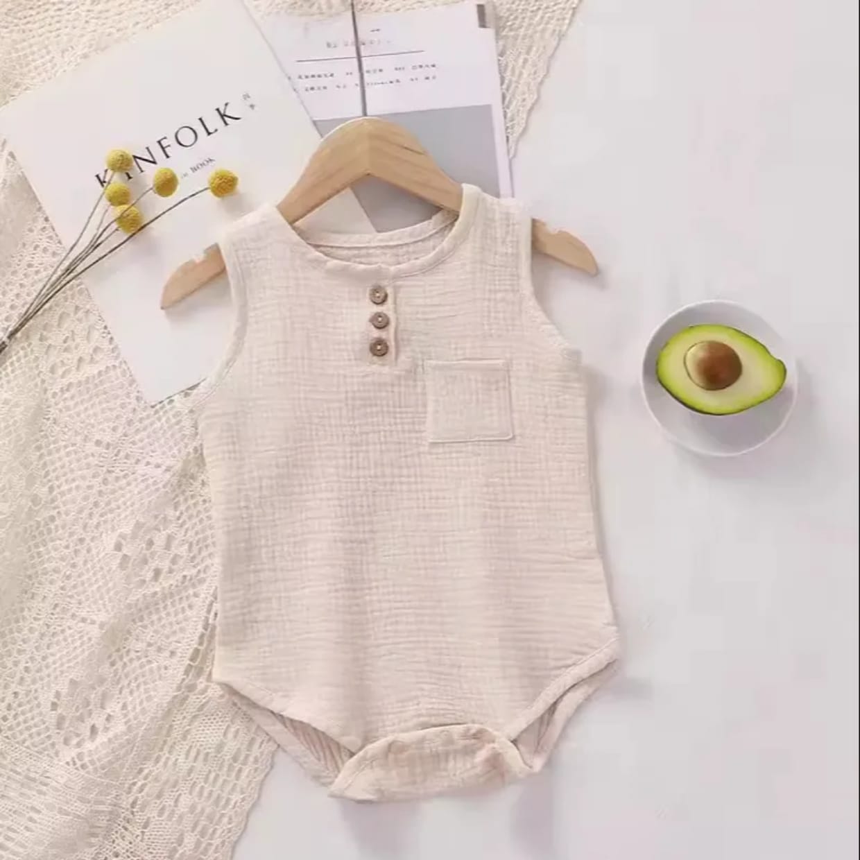 This baby knitted cotton romper is designed to keep your little one comfortable and stylish all day. Made from 100% soft cotton, it’s breathable, gentle on delicate skin, and perfect for everyday wear. The sleeveless design ensures ease of movement, while the front button detail and small chest pocket add a charming touch.
