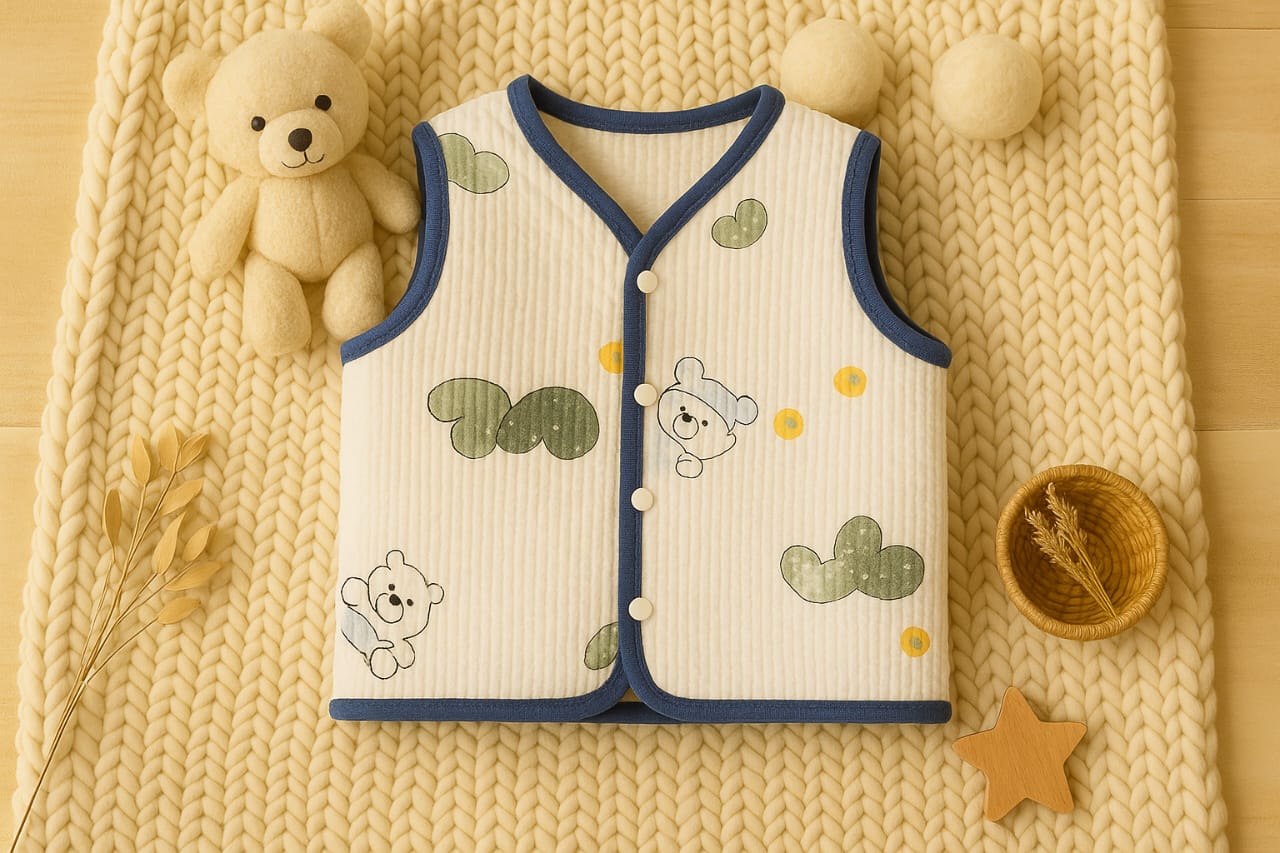 Baby Woolen Cotton Vest with Cute Bear Print & Easy Snap Buttons