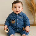 Keep your little one cozy and cute with this bear-themed baby romper featuring an adorable embroidered bear face, 3D ears on the chest, and a playful tail detail at the side. Made from a soft and breathable blend of 80% cotton and 20% polyester, this romper combines comfort with durability. The denim-style fabric gives it a trendy look, while the snap-button closure ensures easy dressing and quick diaper changes. Perfect for daily wear, outings, or as a thoughtful gift for newborns and toddlers.