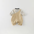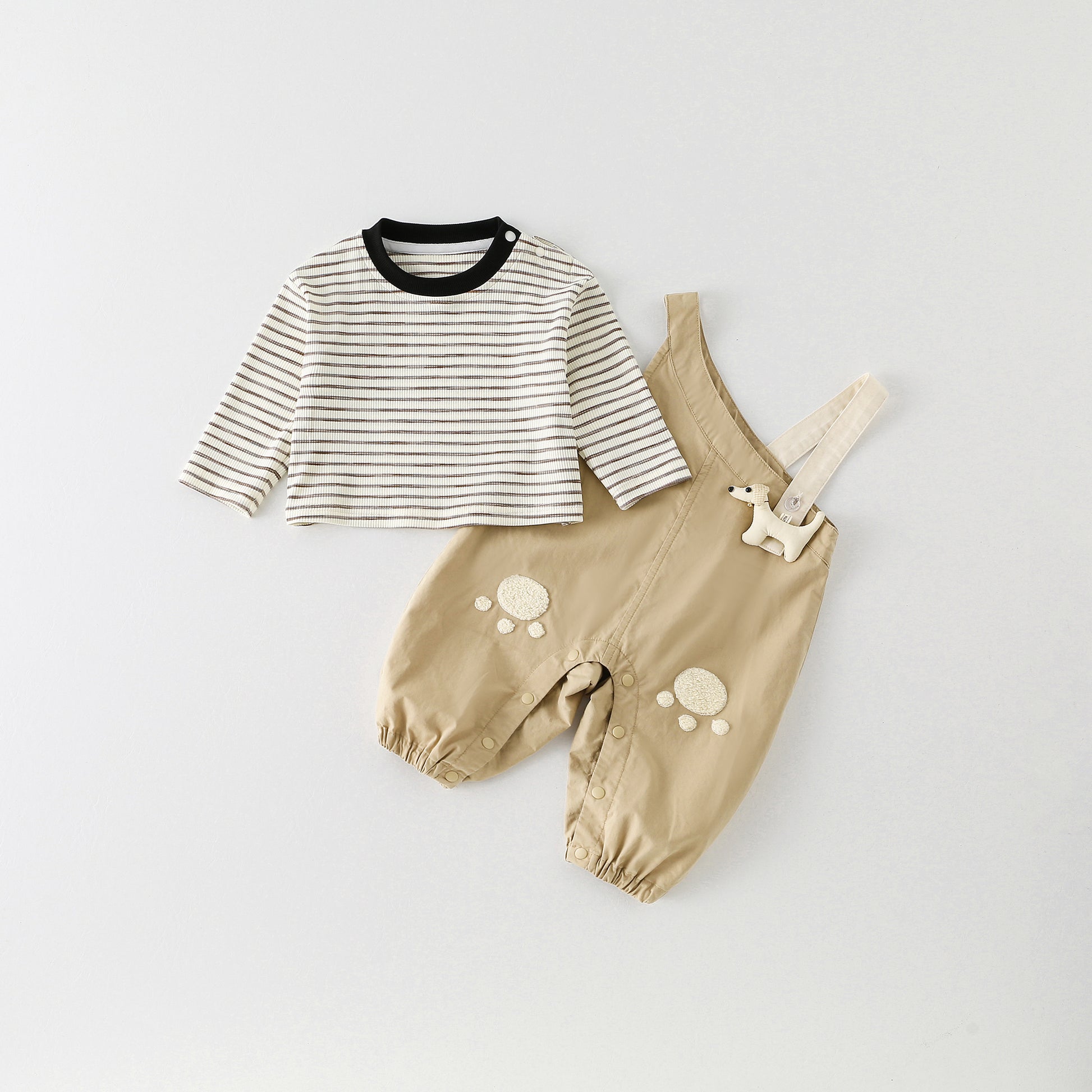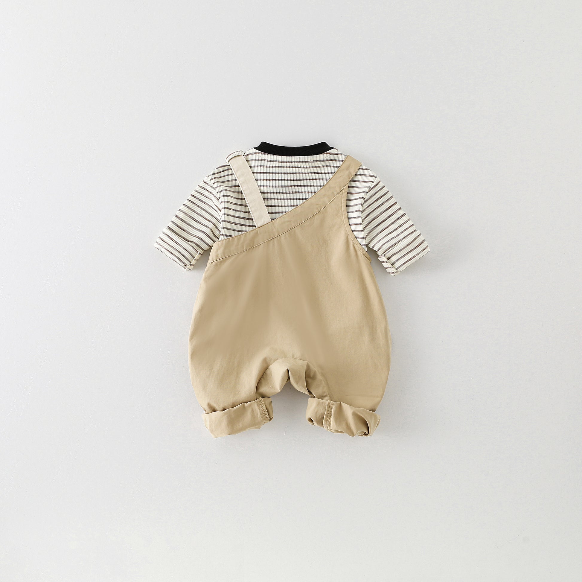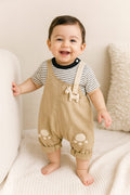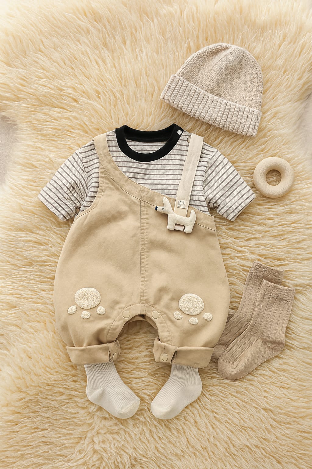 This adorable baby romper set includes a beige cotton suspender-style romper with cute bear paw appliqué and a soft striped short-sleeve top. The romper is made from 100% cotton for comfort and breathability, while the top blends 93% polyester and 7% spandex for a flexible, soft fit. Featuring snap buttons for easy dressing and diaper changes, this outfit is perfect for daily wear, photoshoots, or gifting. Stylish yet practical, it keeps your little one comfy all day.