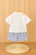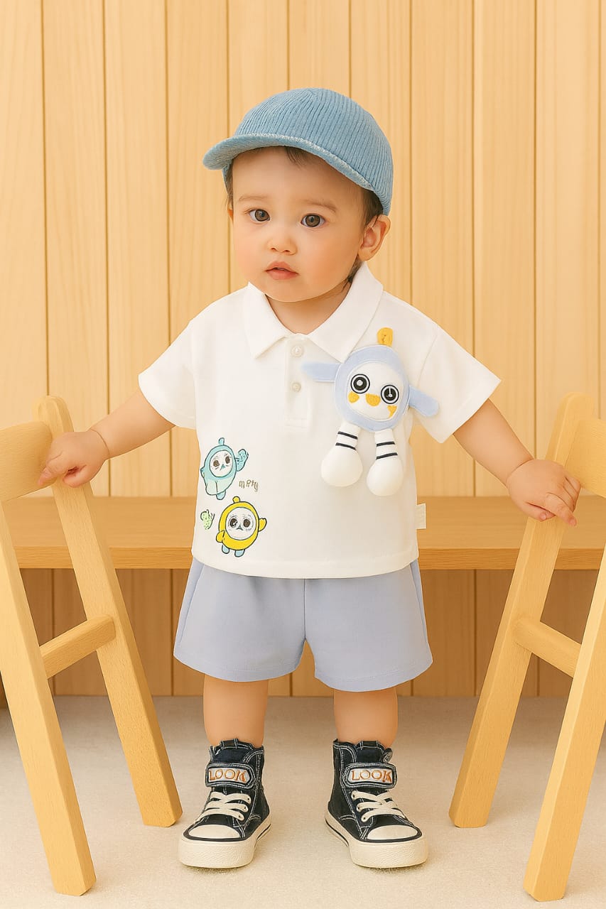 Keep your little one looking stylish and comfy in this 2-piece baby outfit set, featuring a white polo-style T-shirt with playful cartoon embroidery and matching light blue shorts. Made from 100% cotton, this set is ultra-soft, breathable, and gentle on baby’s skin – perfect for daily wear, playtime, or casual outings. The polo collar adds a smart touch while the loose-fit shorts ensure all-day comfort and ease of movement.