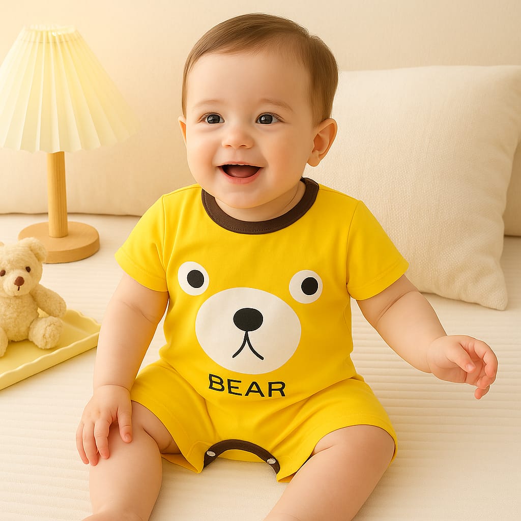 Cute Yellow Bear Baby Romper – 100% Cotton, Soft Knitted Fabric | Short Sleeve Onesie