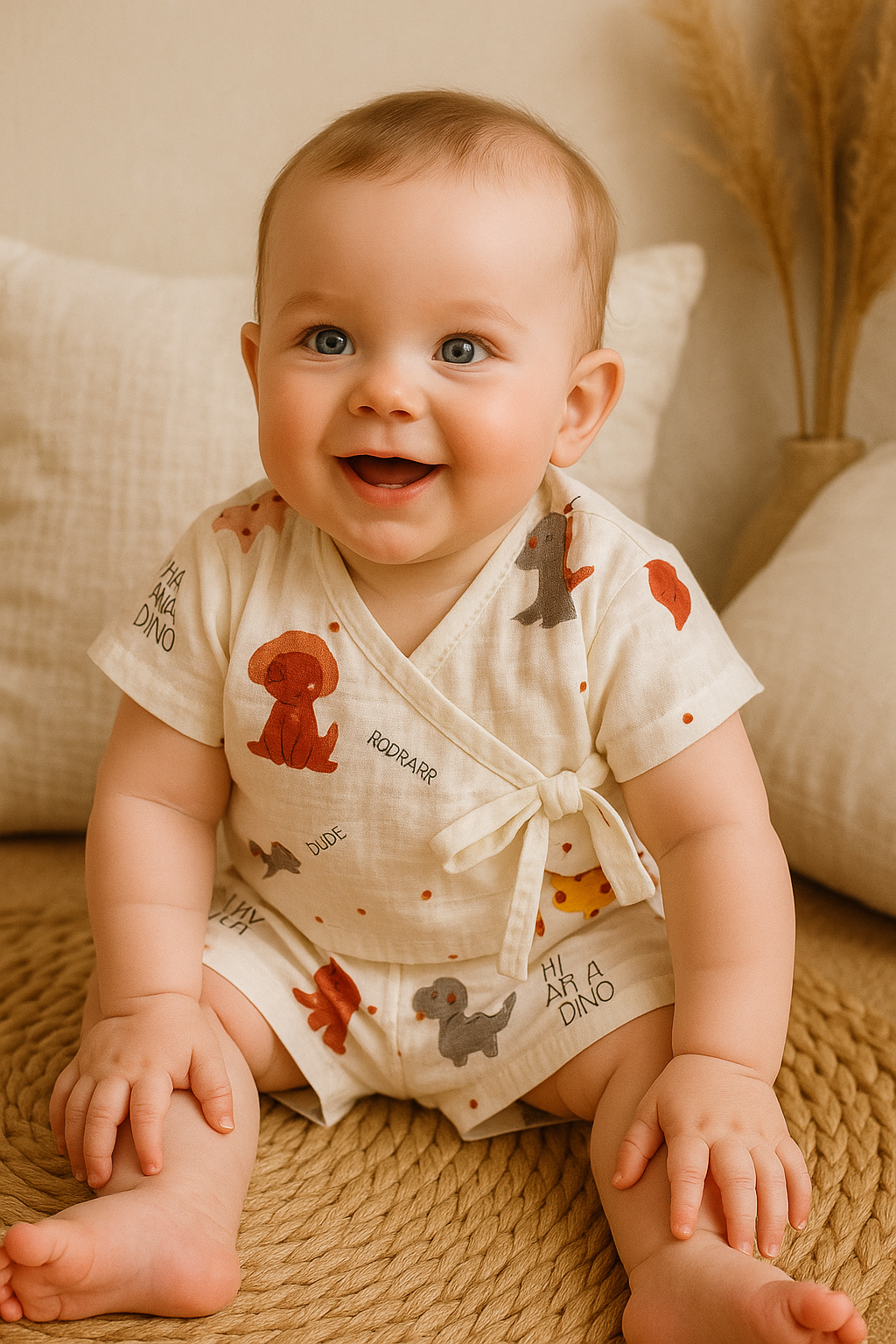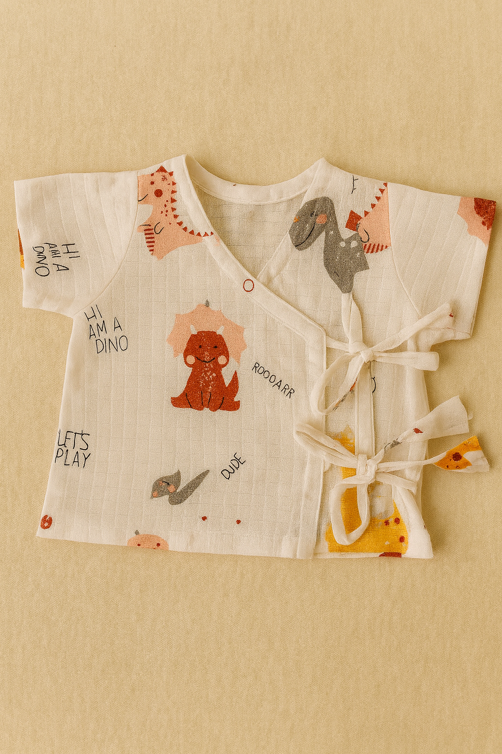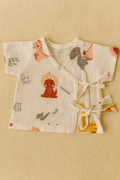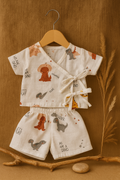 Wrap your little one in comfort and cuteness with our Dino Roar Anghrakha Jabla Set! Made from ultra-soft and breathable 100% muslin cotton, this traditional Indian anghrakha-style jabla top features playful dinosaur prints and fun little quotes like "Hi, I am Dino" and "Let’s Play." The side-tie design ensures a snug, adjustable fit that's easy to wear, while the matching shorts provide complete comfort for daily wear.