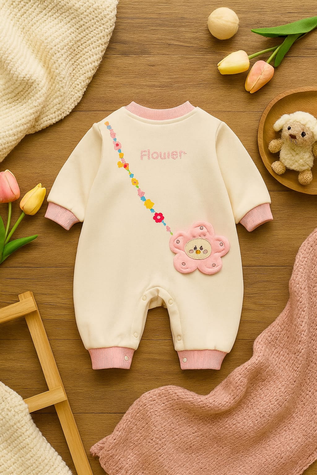 Brighten up your baby’s wardrobe with this adorable floral appliqué romper, featuring a cute flower patch and colorful floral design. Made from a soft blend of 52% cotton and 48% polyester, it offers both breathability and durability for everyday wear. The ribbed cuffs and neckline provide a snug yet gentle fit, while the snap button closure at the legs makes diaper changes quick and easy. Perfect for playtime, outings, or cozy indoor wear.