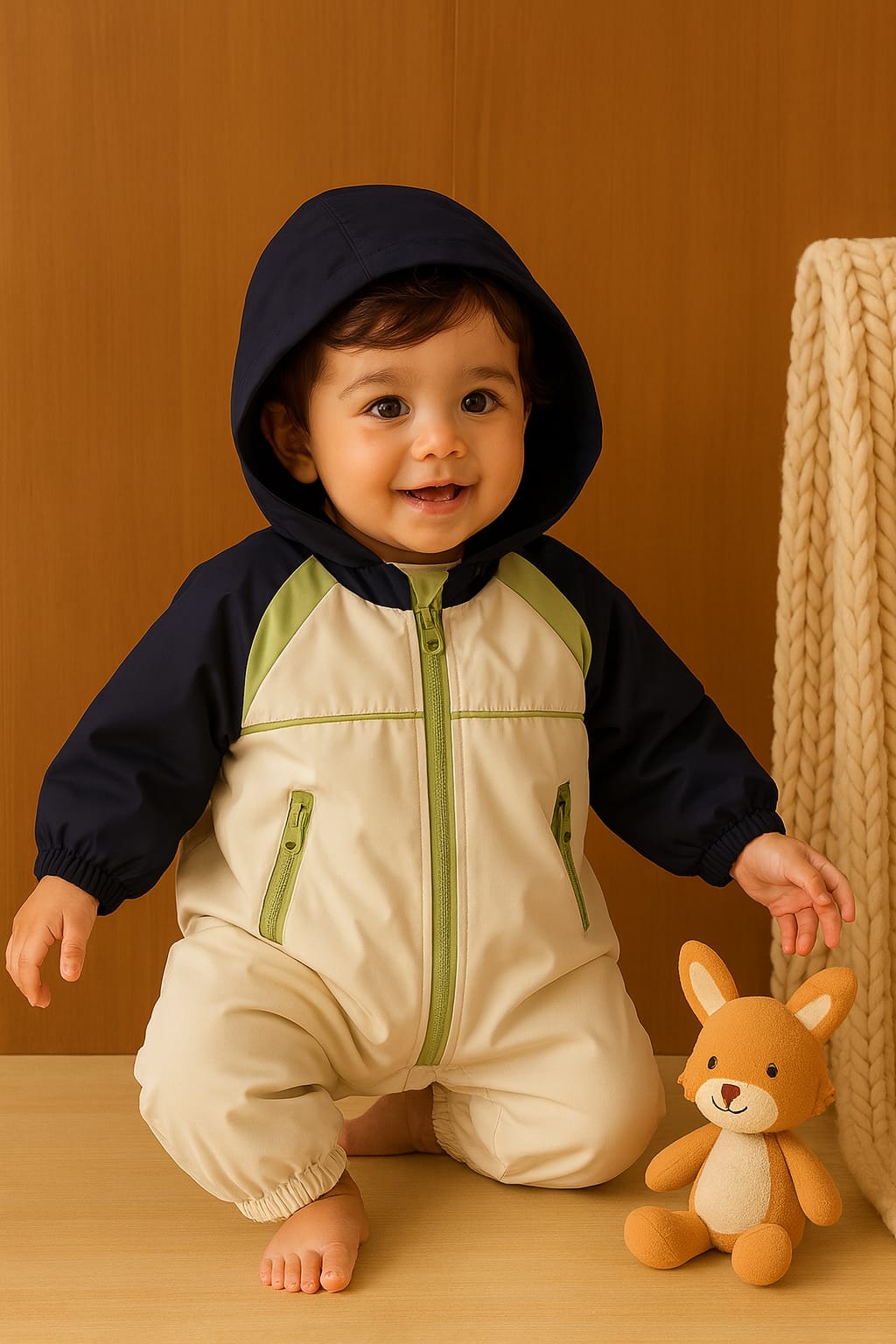 Hooded Baby Romper with Zip Closure – Colorblock Design & Cozy Lining