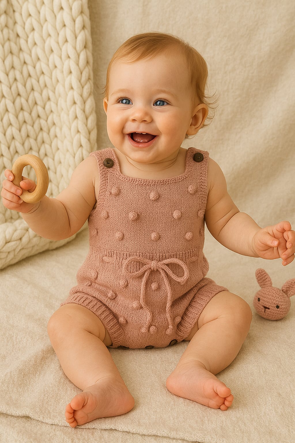 Dress your little one in cozy charm with this Knitted Cotton Baby Romper. Designed with a sleeveless cut, playful pom-pom knit pattern, and a cute waist tie, this romper is perfect for daily wear, playdates, special occasions, or gifting.