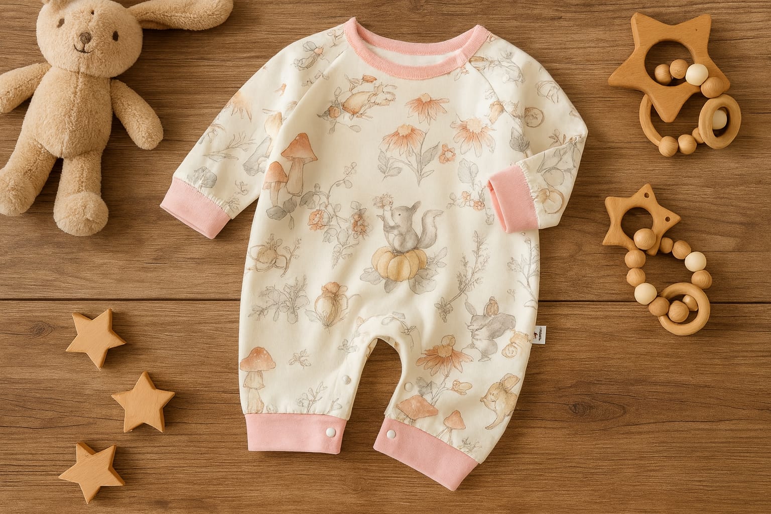 Soft nature-inspired print with bunnies, mushrooms & flowers