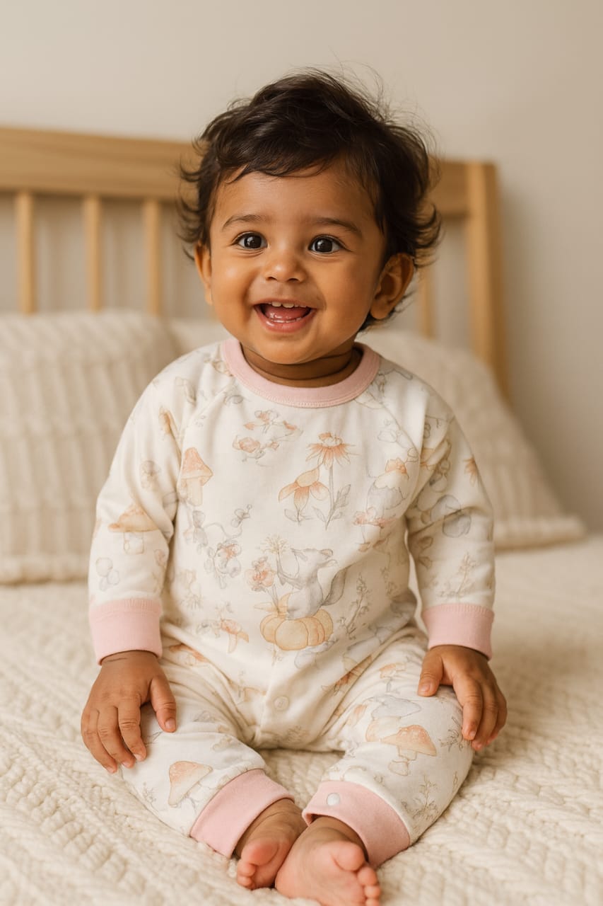 Keep your little one cozy and stylish with this organic cotton knitted romper featuring soft pastel nature prints. Made from 100% organic cotton, this romper is breathable, gentle on delicate skin, and eco-friendly. The snug ribbed cuffs and easy snap button closure at the legs make dressing and diaper changes quick and convenient. Designed with a whimsical woodland theme of flowers, mushrooms, and bunnies, it’s perfect for everyday wear, lounging, or gifting.