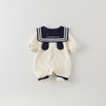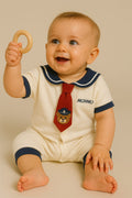 ress your little one in classic charm with this Sailor Bear Tie Baby Romper. Designed with a cute sailor-style collar, navy trims, and an adorable bear tie detail, this romper adds a playful yet smart touch to your baby’s wardrobe. Crafted from 100% soft cotton, it ensures maximum comfort, breathability, and gentle care for delicate skin. Snap buttons at the front and bottom make dressing and diaper changes effortless. Perfect for casual outings, photo sessions, or gifting, this romper blends style, comfort, and convenience in one.