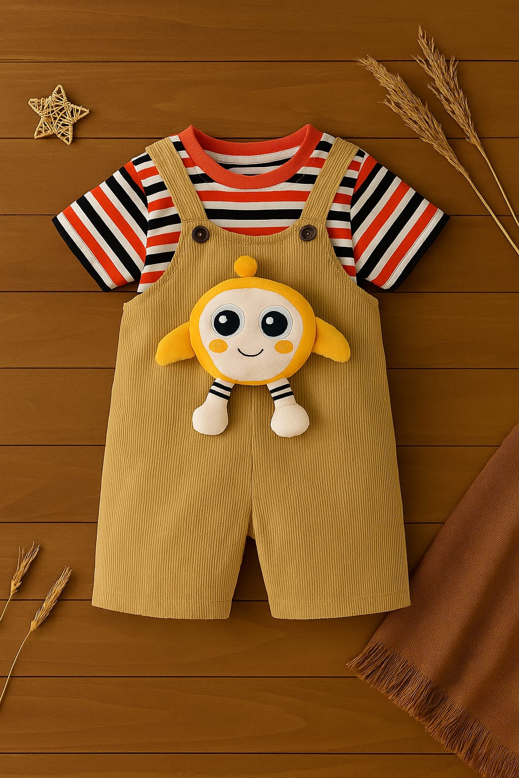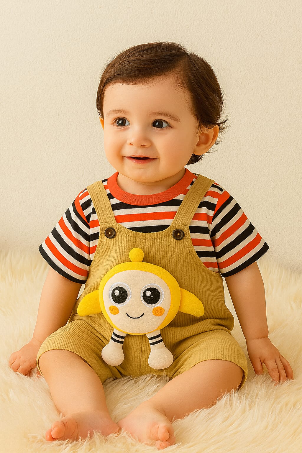 Dress your little one in style with this adorable 2-piece baby romper set, featuring a vibrant striped T-shirt and a soft yellow dungaree with a cute plush toy design in front. Made from 100% cotton, this outfit is breathable, gentle on delicate skin, and perfect for playtime, outings, or casual wear. With buttoned straps and snap closures, dressing and diaper changes are quick and easy. A fun and comfortable everyday essential for your baby’s wardrobe.